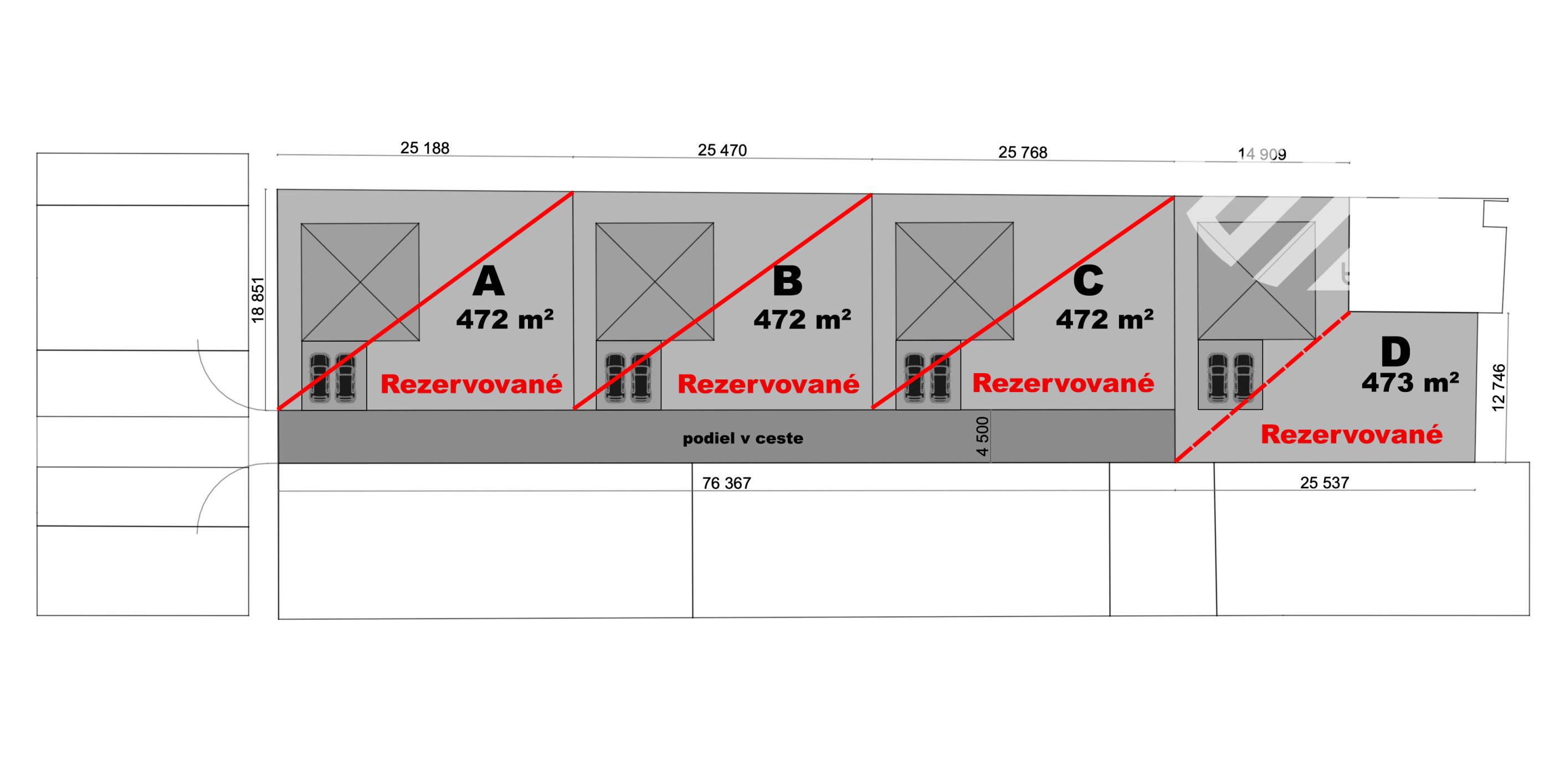 - Výmera: 473 m² + 86 m² podiel v súkromnej prístupovej ceste